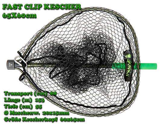 Kompaktes Netz, ideal für Barsch, Zander und mittelgroße Hechte. Einfach zu benutzen, egal ob vom Ufer oder Boot, das Netz öffnet sich mit einer einfachen Bewegung, der Angler kann sich auf den Drill konzentrieren.![]() Leichter Transport, der Kescher kann an einen Rucksack oder Angelweste geclipt werden und ist dann griffbereit. EVA Komfort Griff. Stab und Kopf aus Alu. | ||||||||||