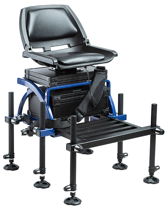 Professioneller und sehr stabiler Feedersitz mit viel Stauraum, Fusspodest und