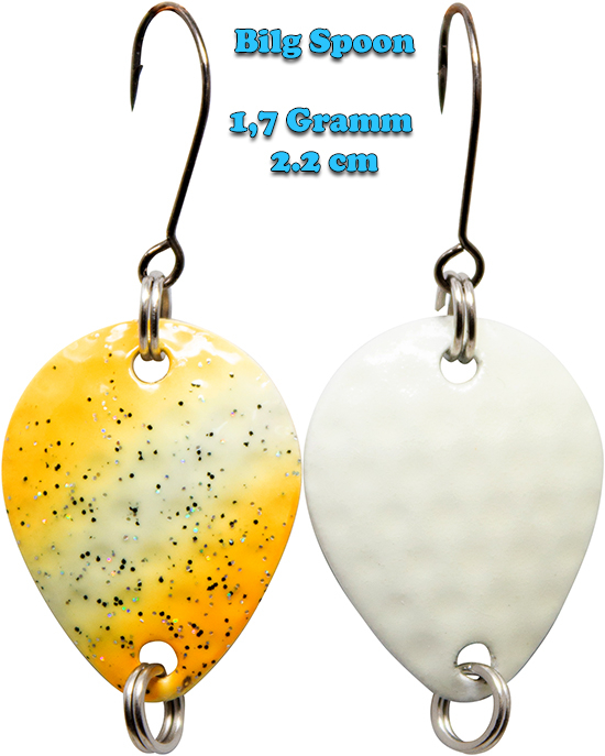 Der 2.2 cm lange Bilg Spoon wurde aus besonders dünnem Blech gefertigt. Dadurch bewegt er sich spieled leicht - ähnlich wie ein fallendes Laubblatt im Herbstwind.
